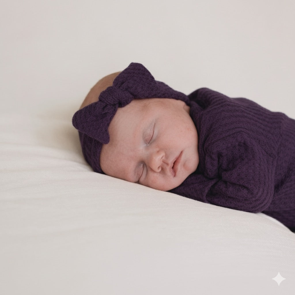 Rich and sweet, our purple waffle knit outfit adds a touch of charm to your baby’s wardrobe. With cozy cuffed sleeves and a knot at the hem, it’s made for peaceful naps and quick midnight changes.