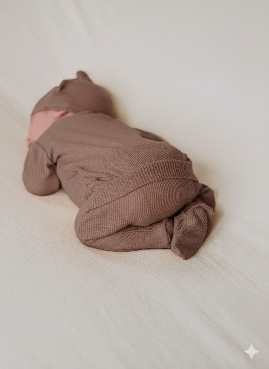 Crafted from ultra-soft waffle knit in a timeless stone hue, this footie brings a modern, neutral vibe to your little one’s wardrobe. Whether it’s for lounging, nap time, or family photos, it’s a unisex essential that pairs effortlessly with any nursery palette.
