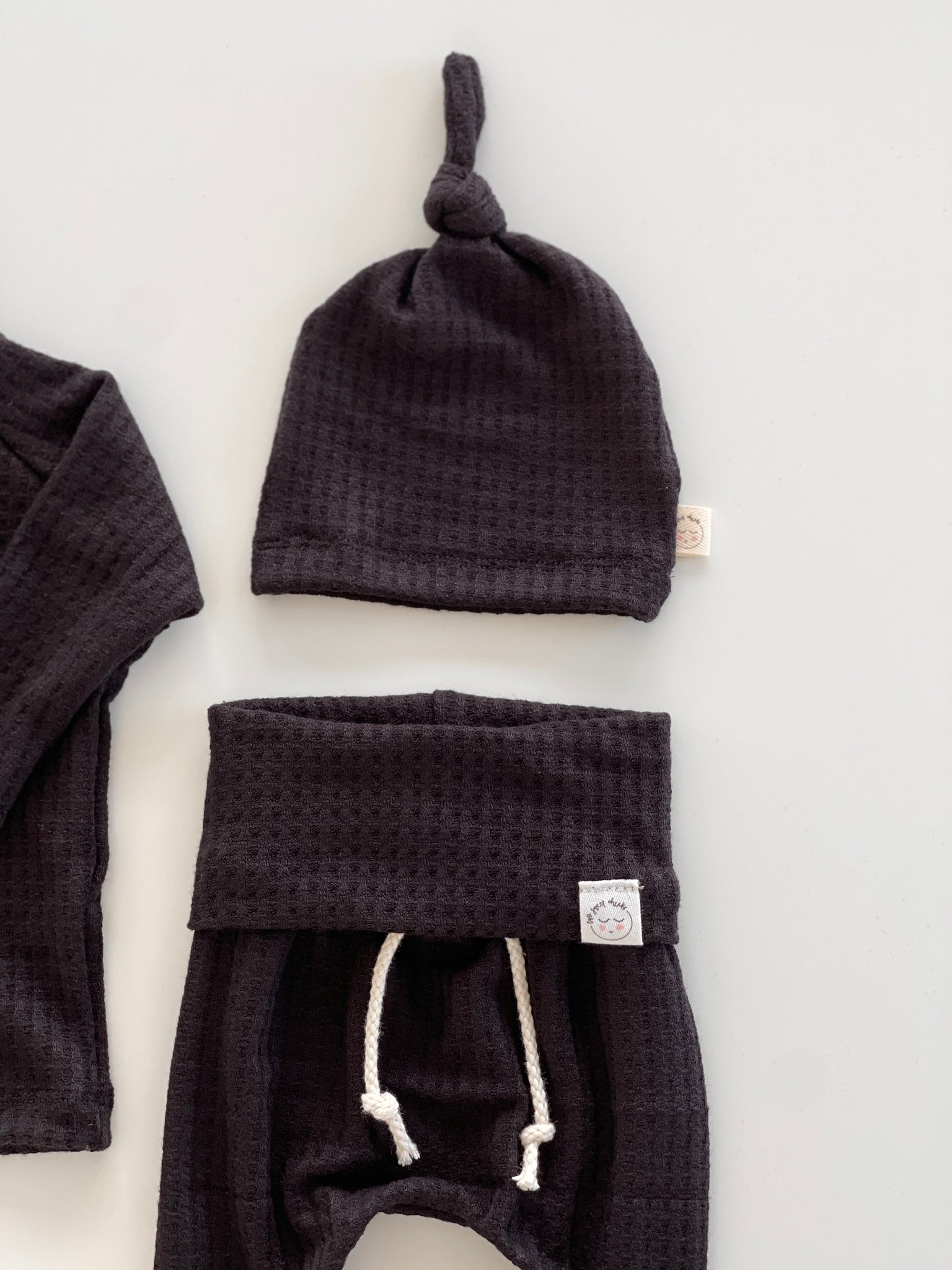Chic and unexpected, the black waffle baby outfit is perfect for parents who love a modern, minimalist style. The soft knit keeps baby comfy while the sleek look stands out in photos.
