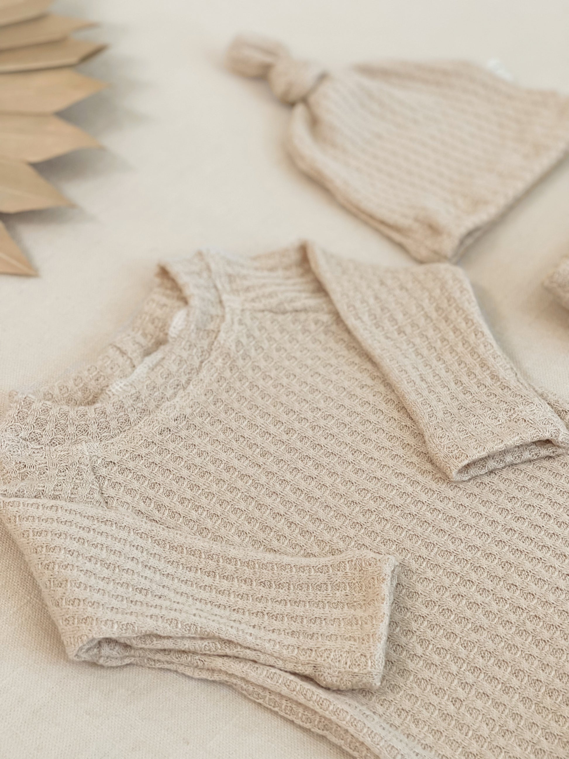 Neutral and cozy, our oatmeal waffle knit pairs beautifully with any blanket, swaddle, or nursery theme, making it a favorite for newborn photos and coming-home outfits.