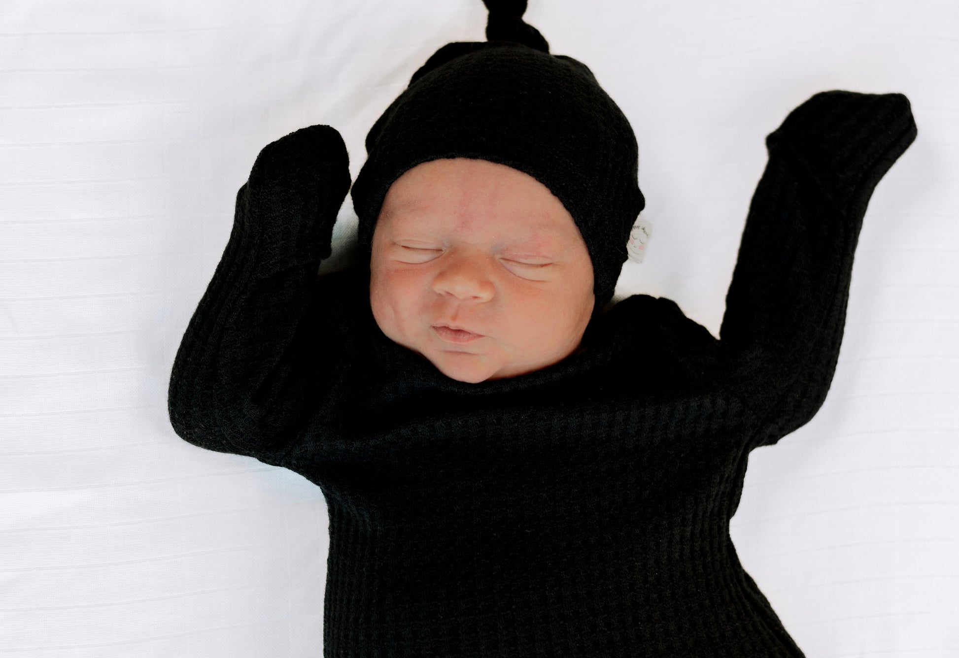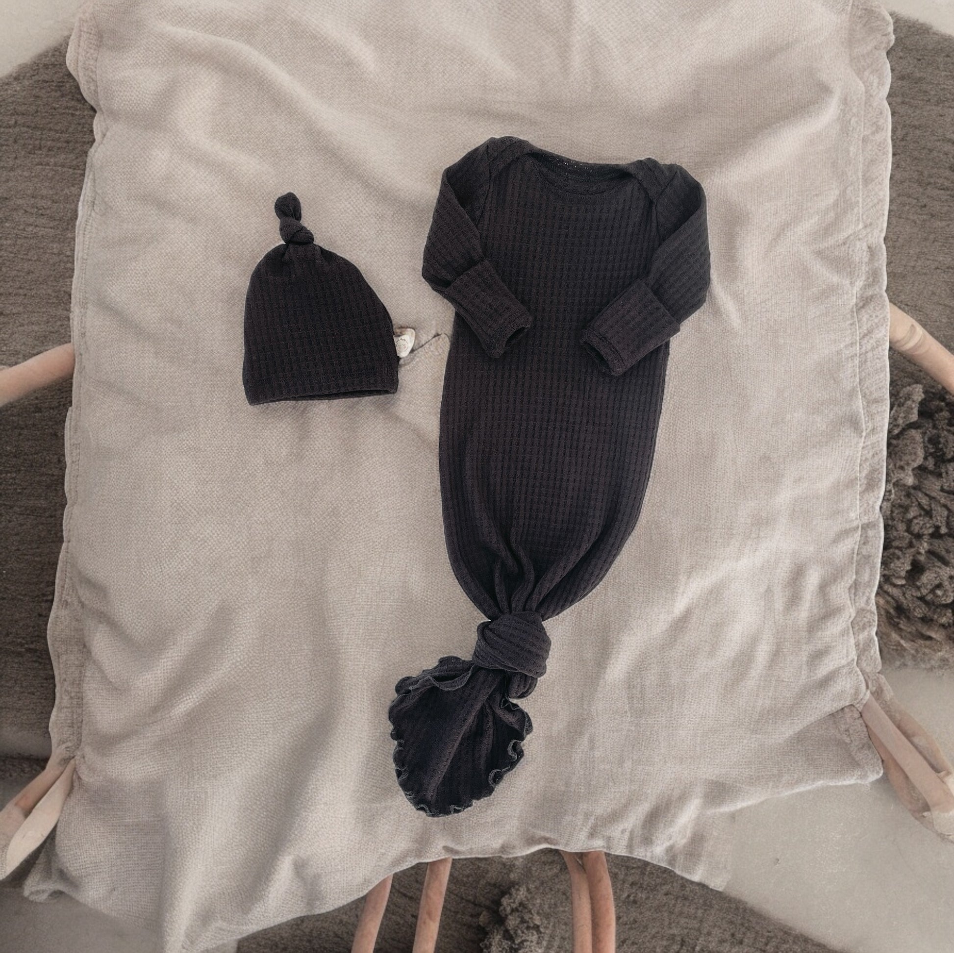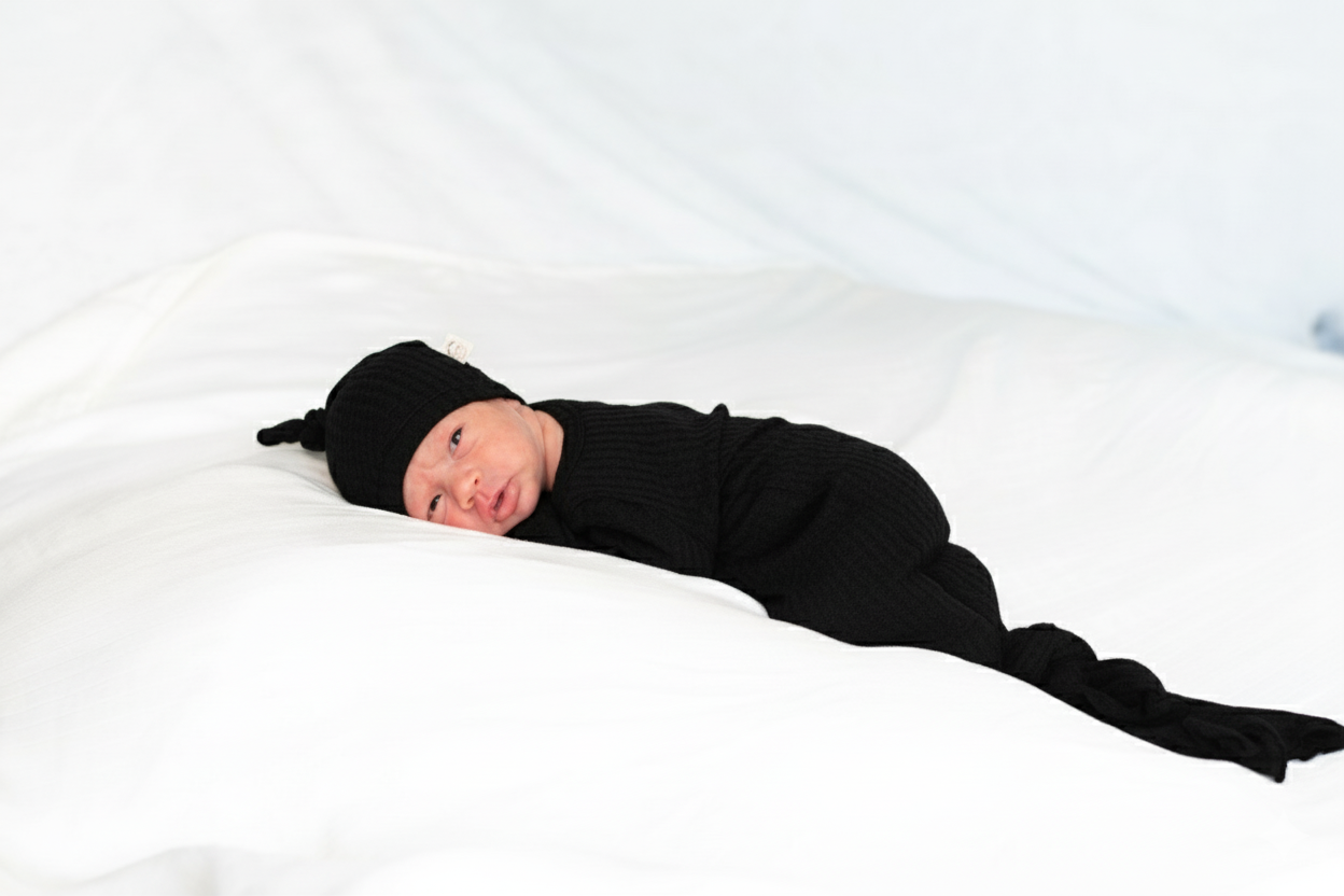 Designed for the earliest days, this knotted baby gown makes diaper changes simple while keeping baby warm and comfortable. The softly knotted hem allows easy access, while gentle cuffs help protect delicate skin and keep little hands cozy—perfect for hospital snuggles, late nights, and slow newborn mornings.