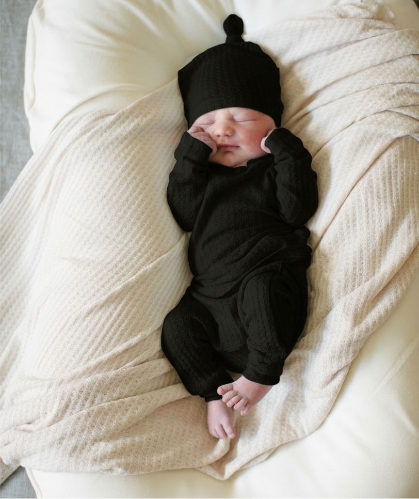 Chic and unexpected, the black waffle baby outfit is perfect for parents who love a modern, minimalist style.