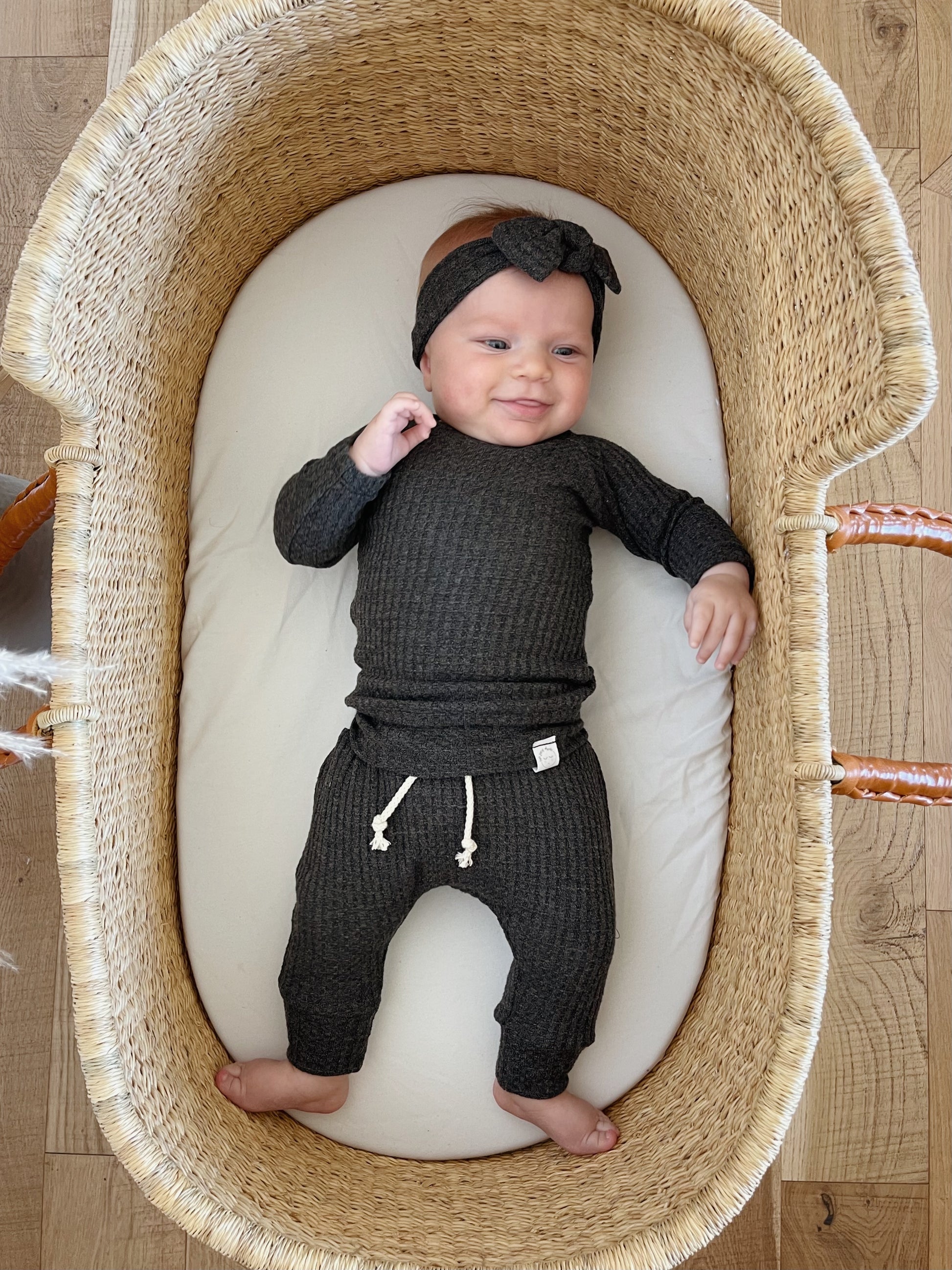 This coordinated waffle knit baby set is designed for everyday comfort with a soft, breathable feel and a flexible fit that moves with your baby. Featuring a fold-over waistband for easy dressing and extended wear, it’s a timeless choice for hospital take-home outfits, newborn photos, and effortless everyday styling.