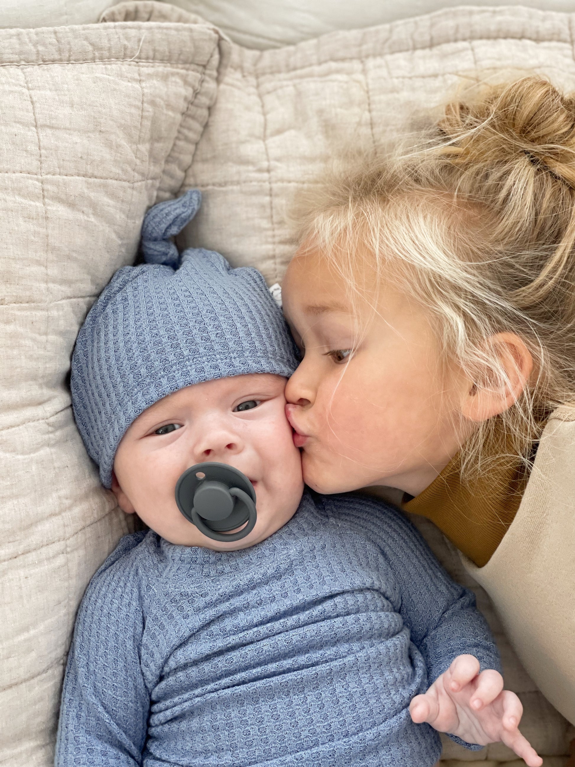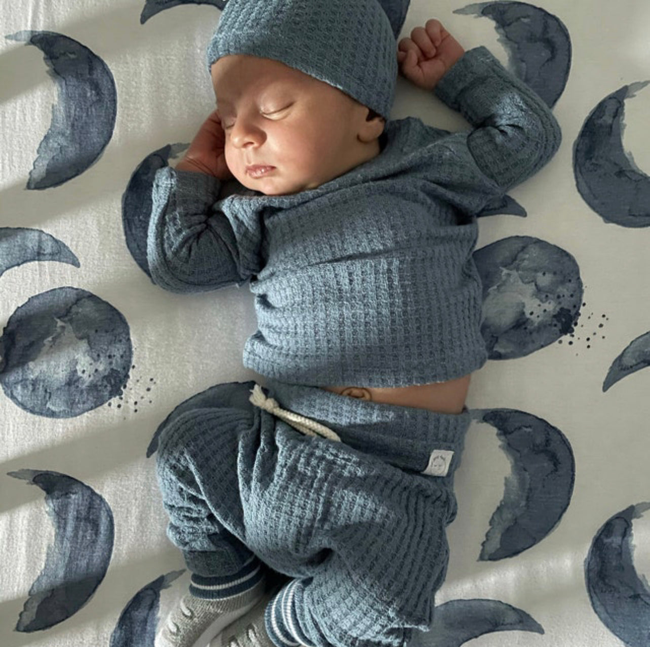 This coordinated waffle knit baby set is designed for everyday comfort with a soft, breathable feel and a flexible fit that moves with your baby. Featuring a fold-over waistband for easy dressing and extended wear, it’s a timeless choice for hospital take-home outfits, newborn photos, and effortless everyday styling.