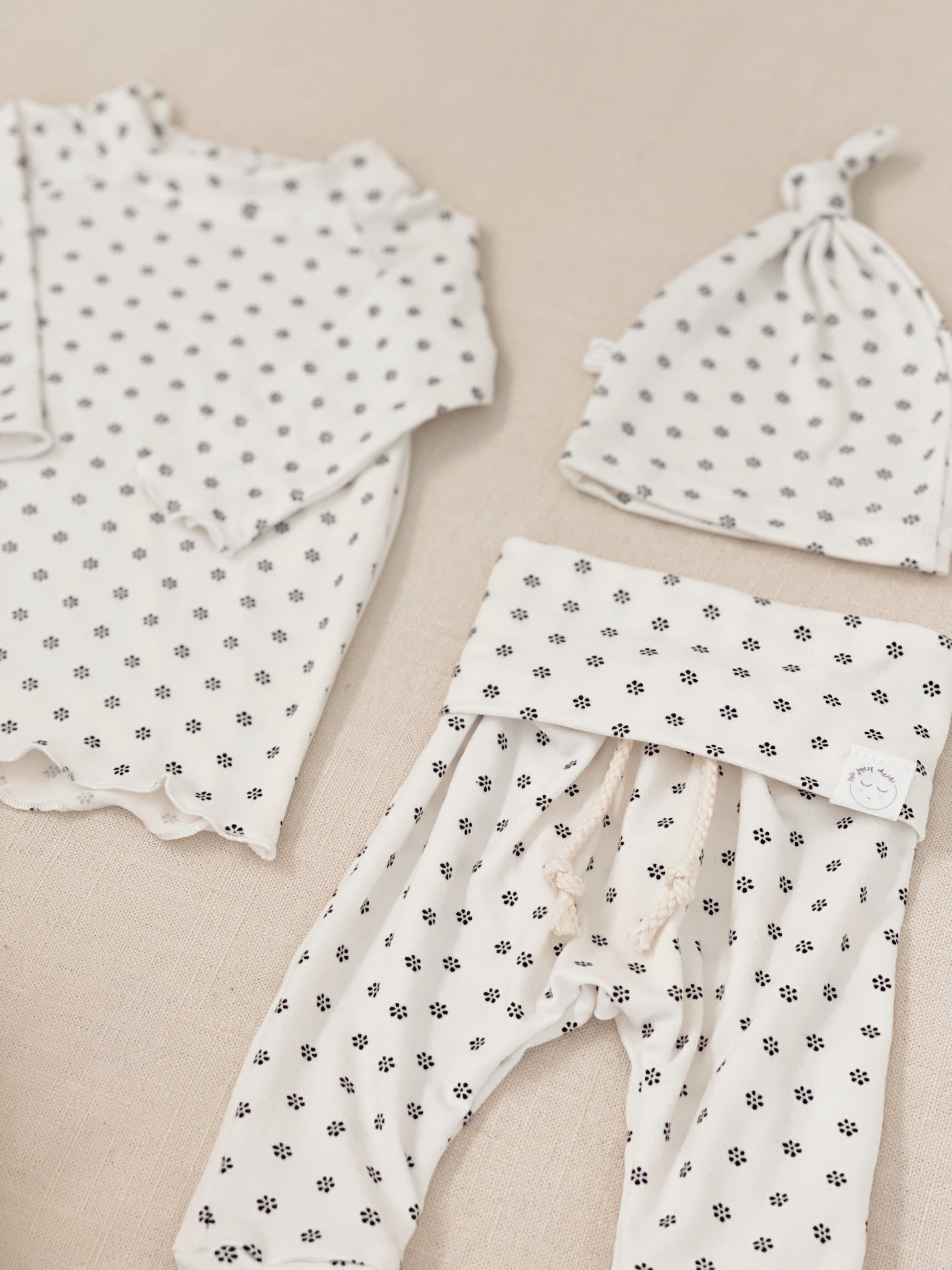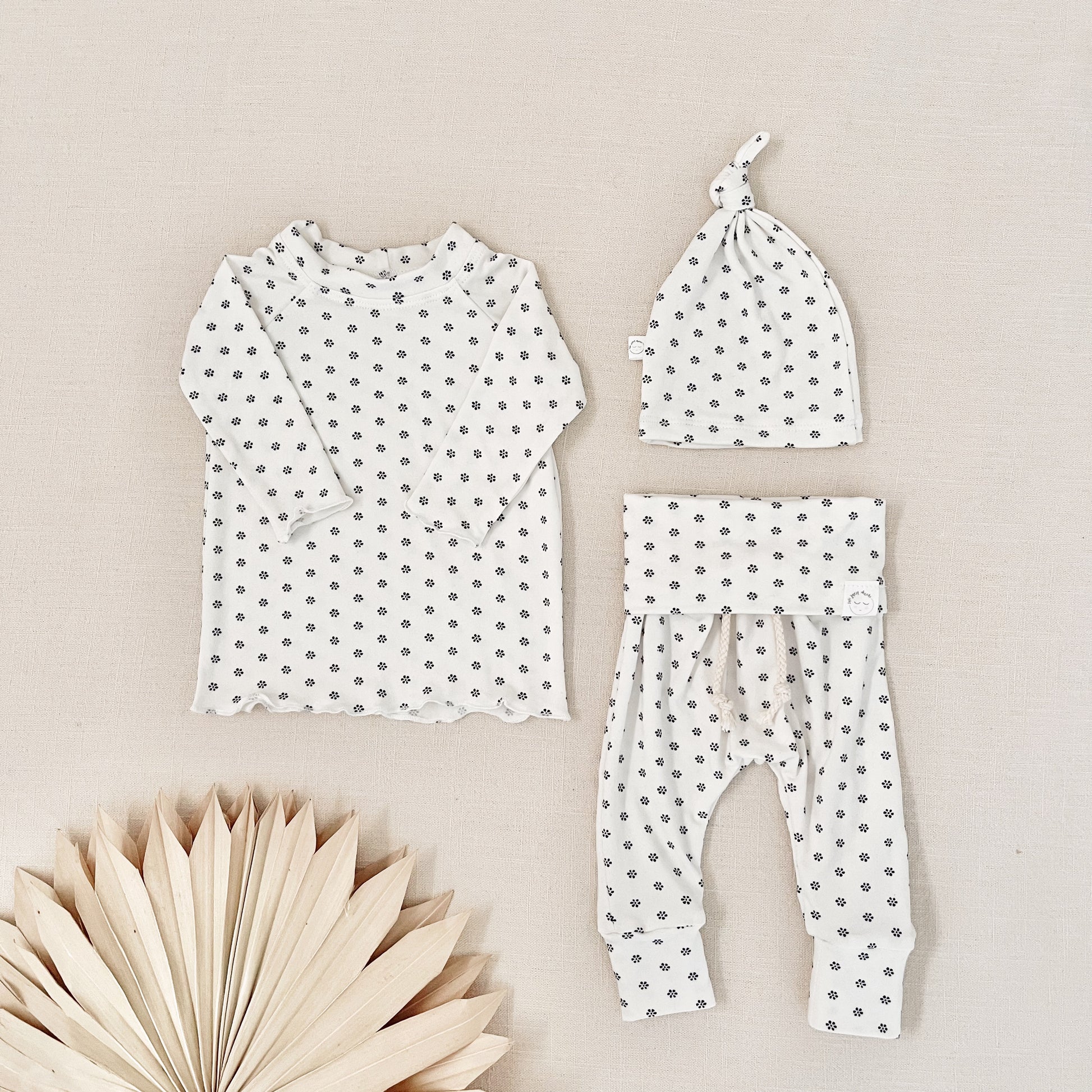 3-piece set includes hat, top, and pants. Made from soft, stretchy knit fabric for everyday comfort, featuring a fold-over waistband for easy dressing and a flexible fit that grows with your baby