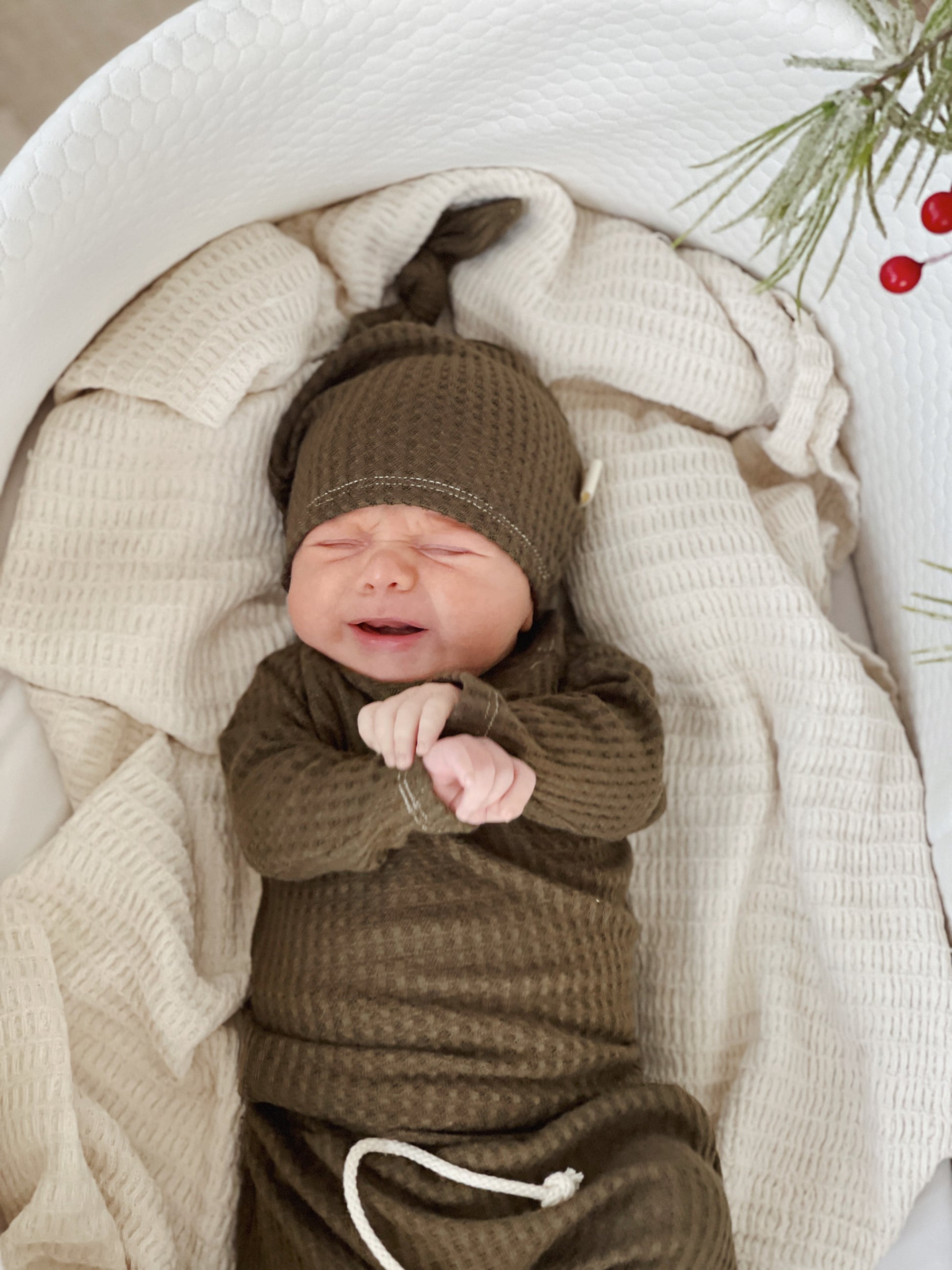 This coordinated waffle knit baby set is designed for everyday comfort with a soft, breathable feel and a flexible fit that moves with your baby. Featuring a fold-over waistband for easy dressing and extended wear, it’s a timeless choice for hospital take-home outfits, newborn photos, and effortless everyday styling.