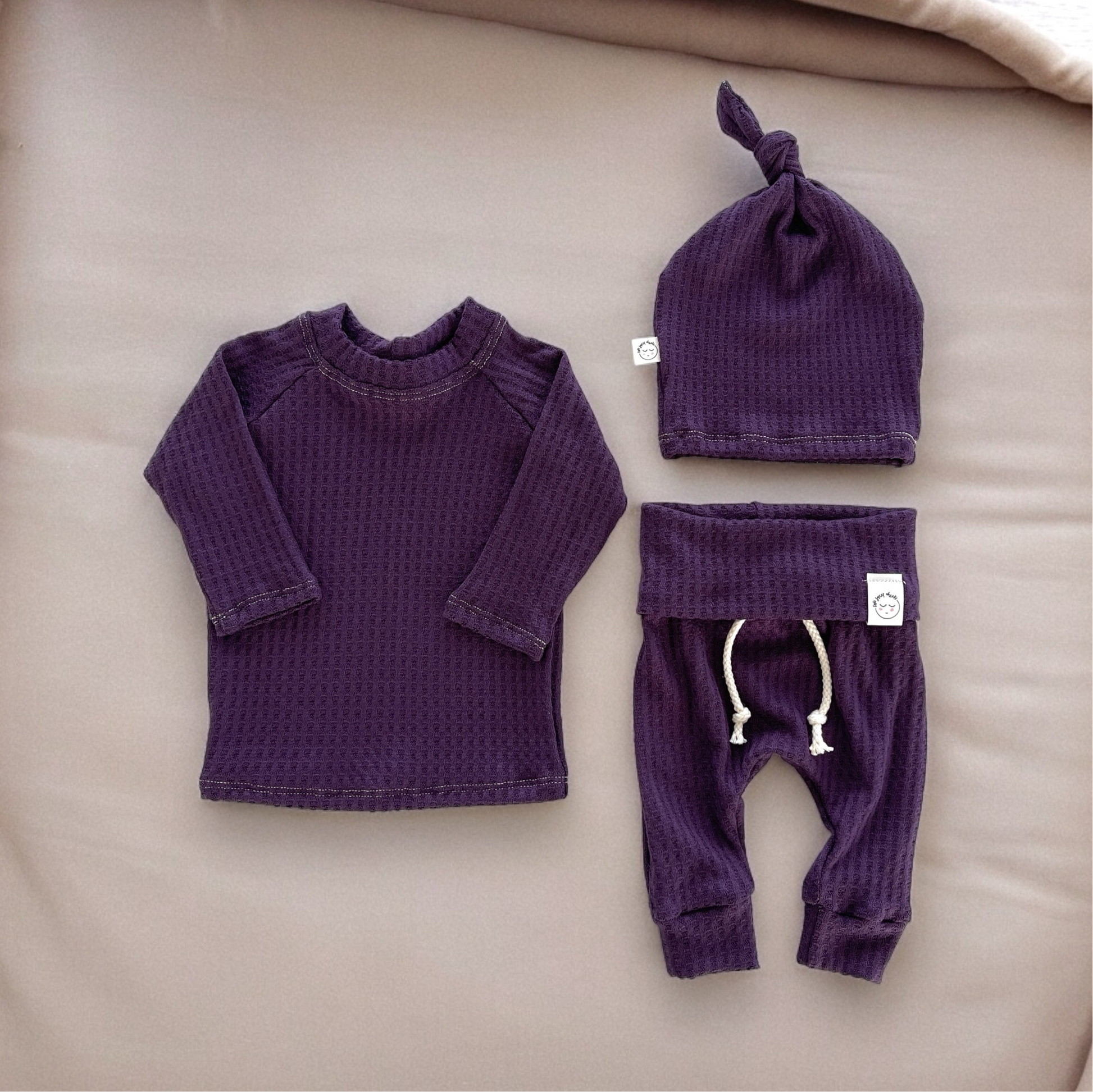 Rich and sweet, our purple waffle knit outfit adds a touch of charm to your baby’s wardrobe.