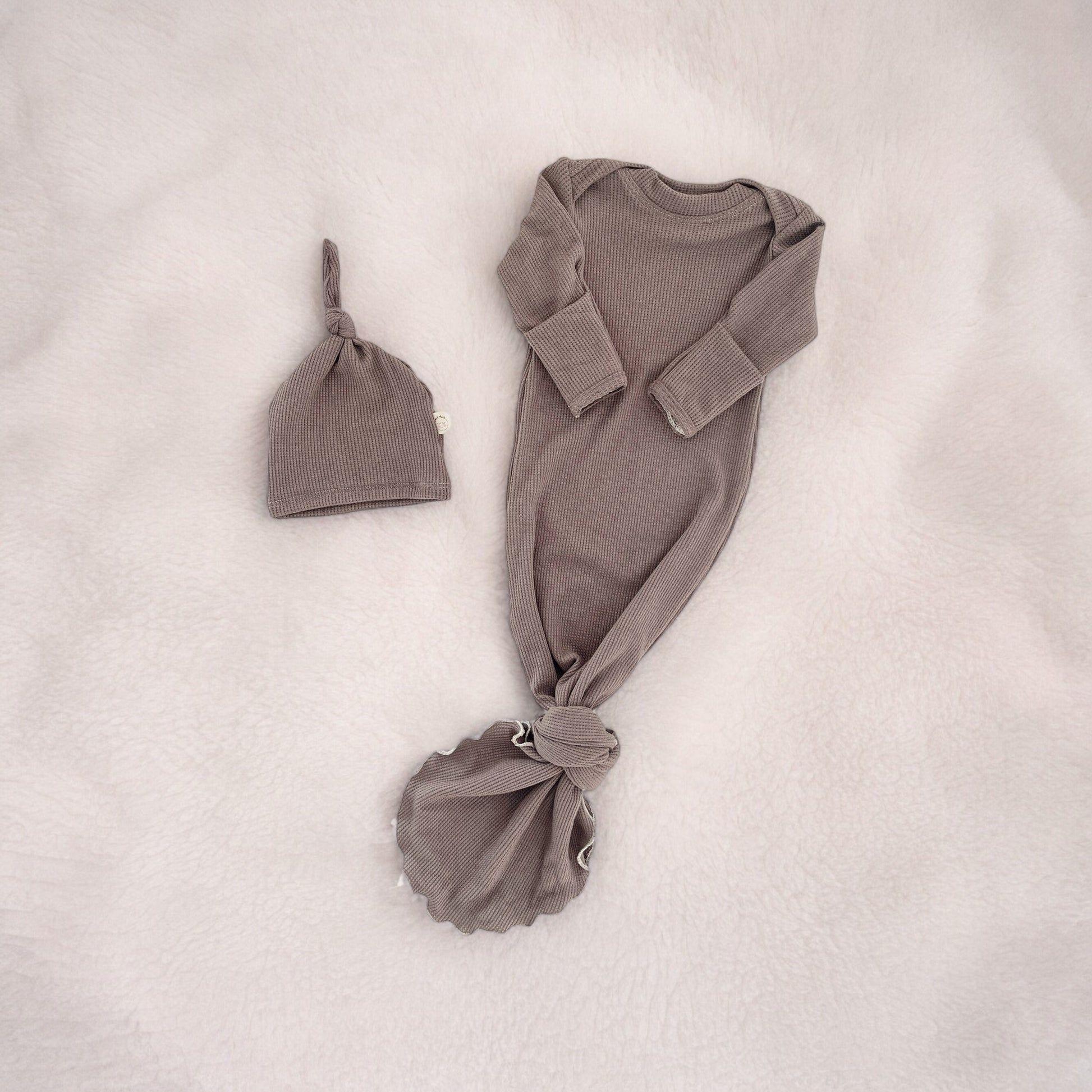 Designed for the earliest days, this knotted baby gown makes diaper changes simple while keeping baby warm and comfortable. The softly knotted hem allows easy access, while gentle cuffs help protect delicate skin and keep little hands cozy—perfect for hospital snuggles, late nights, and slow newborn mornings.