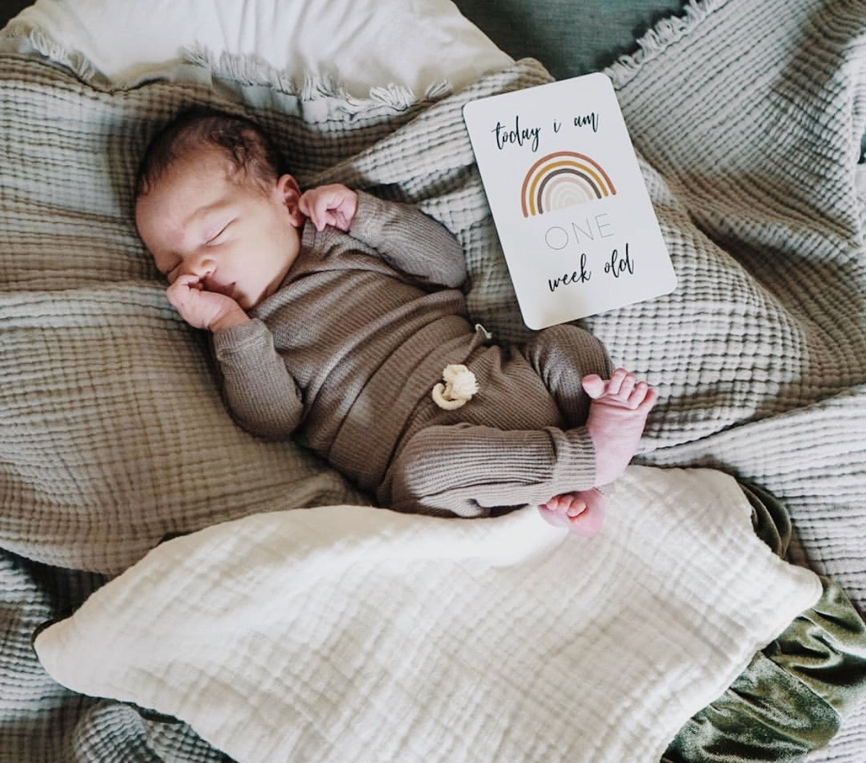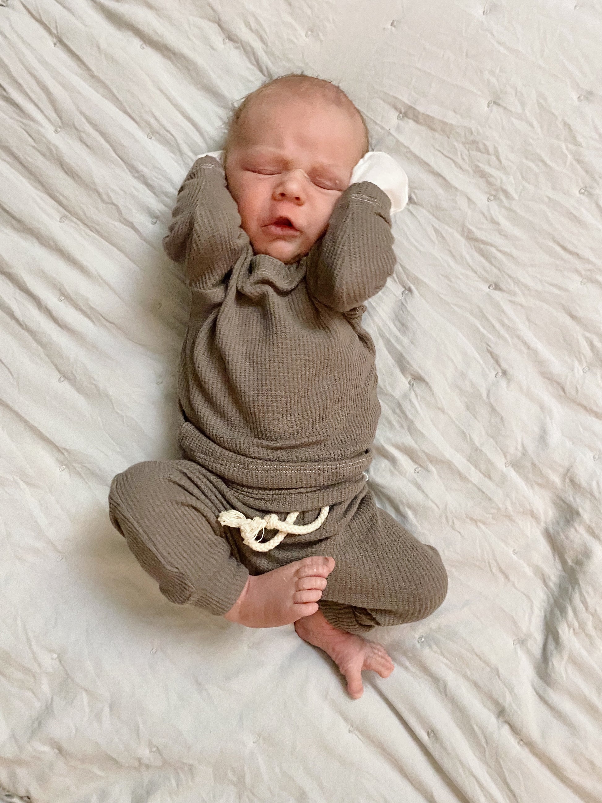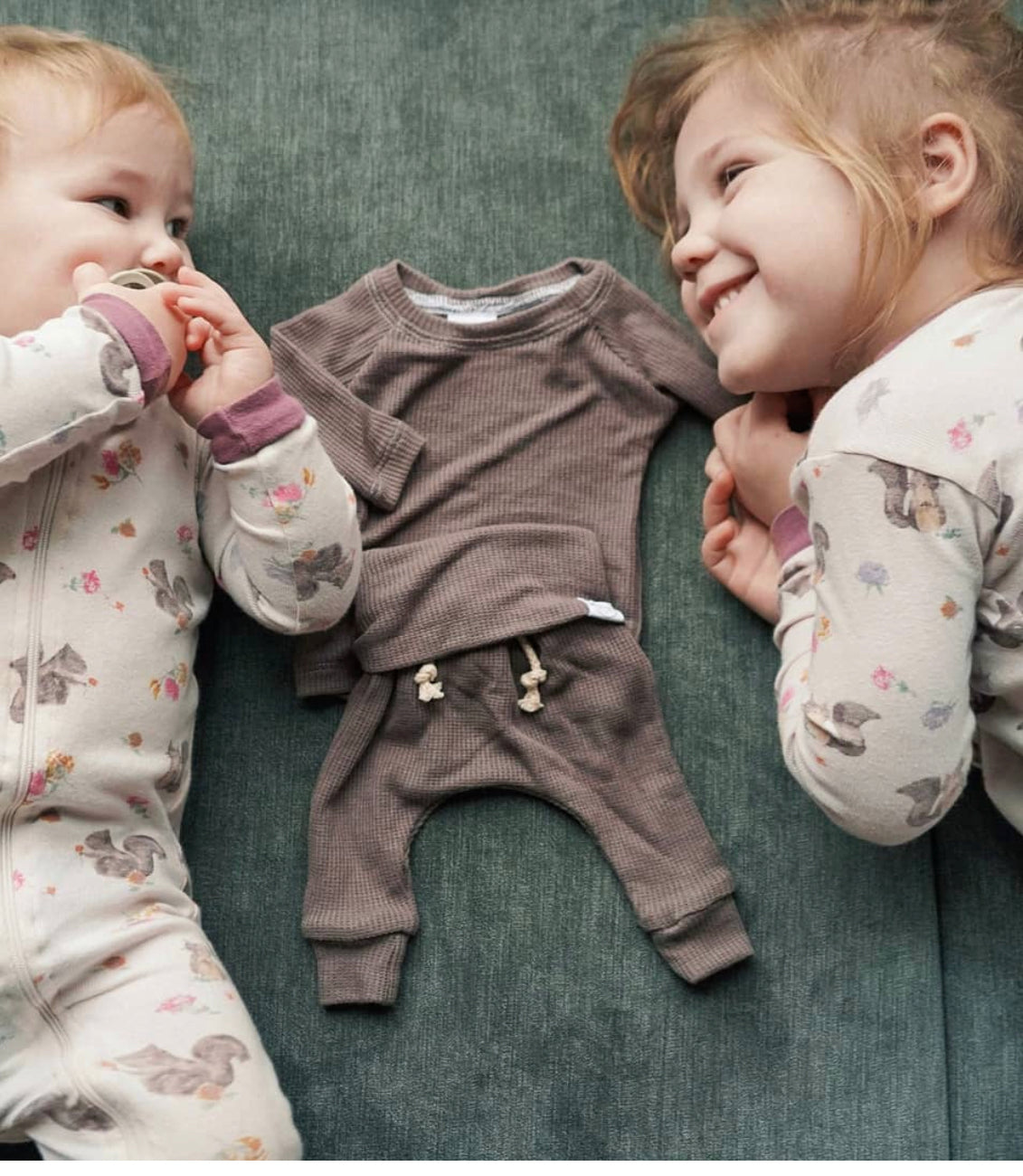 This coordinated thermal knit baby set is designed for everyday comfort with a soft, breathable feel and a flexible fit that moves with your baby. Featuring a fold-over waistband for easy dressing and extended wear, it’s a timeless choice for hospital take-home outfits, newborn photos, and effortless everyday styling.