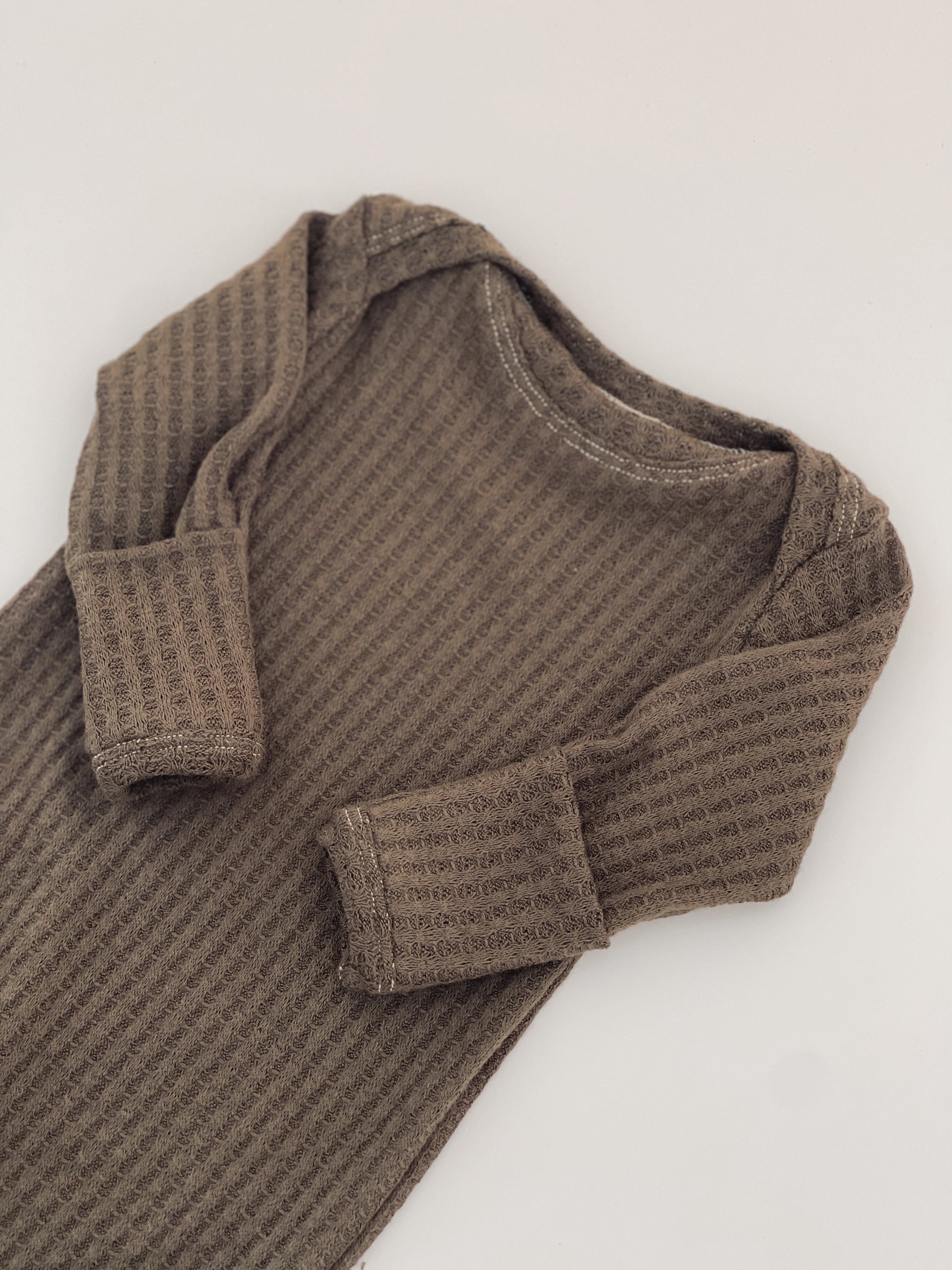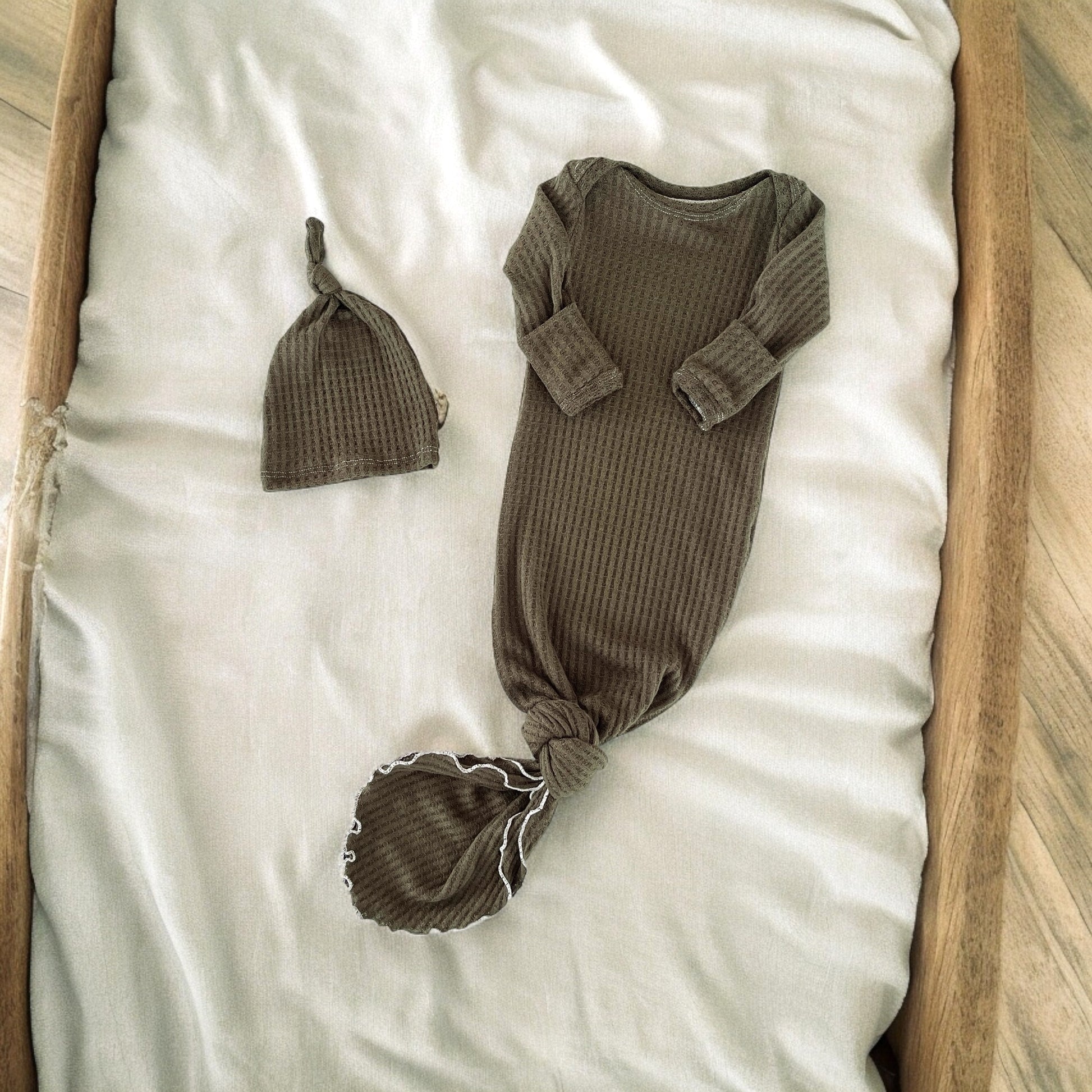 Designed for the earliest days, this knotted baby gown makes diaper changes simple while keeping baby warm and comfortable. The softly knotted hem allows easy access, while gentle cuffs help protect delicate skin and keep little hands cozy—perfect for hospital snuggles, late nights, and slow newborn mornings.