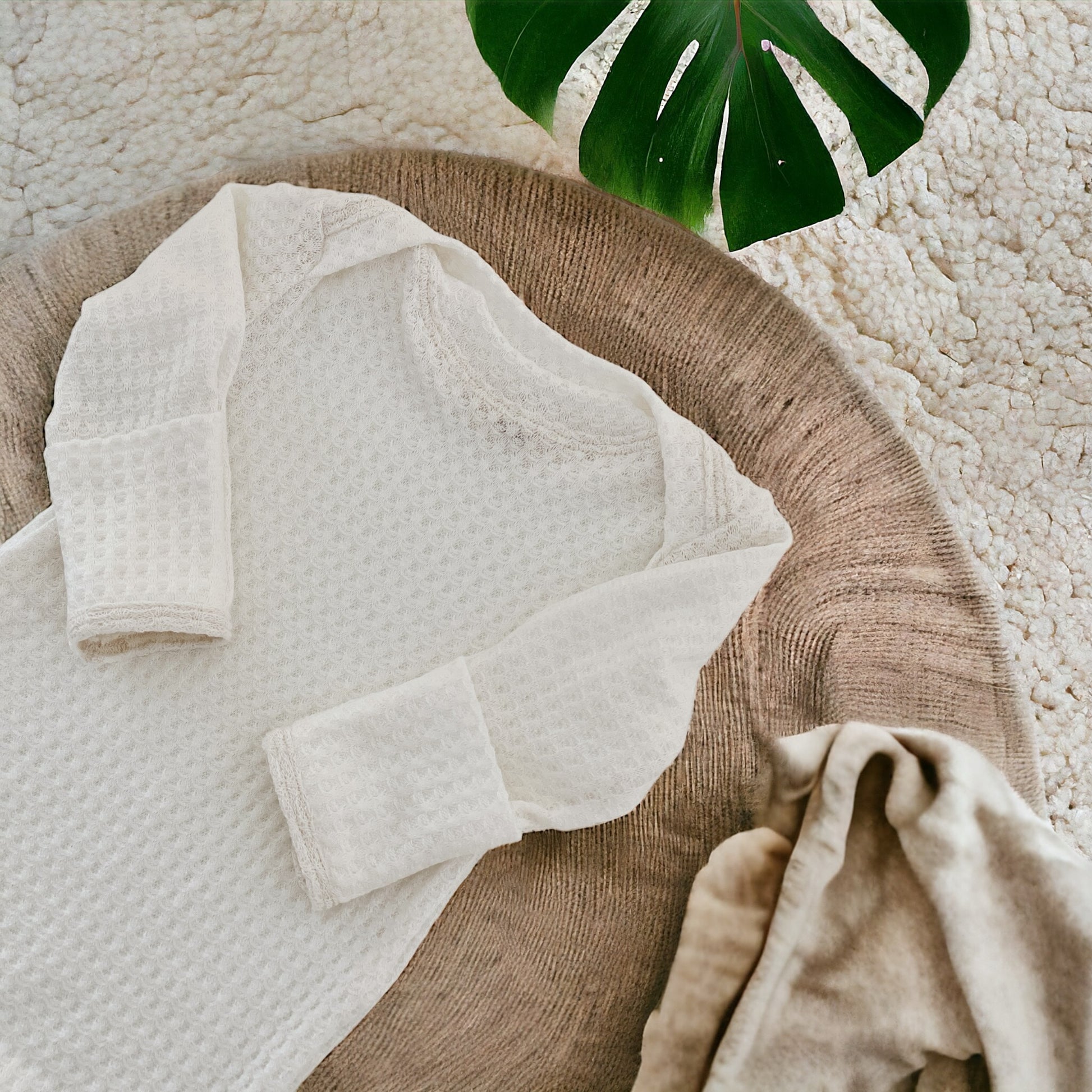 Designed for the earliest days, this knotted baby gown makes diaper changes simple while keeping baby warm and comfortable. The softly knotted hem allows easy access, while gentle cuffs help protect delicate skin and keep little hands cozy—perfect for hospital snuggles, late nights, and slow newborn mornings.