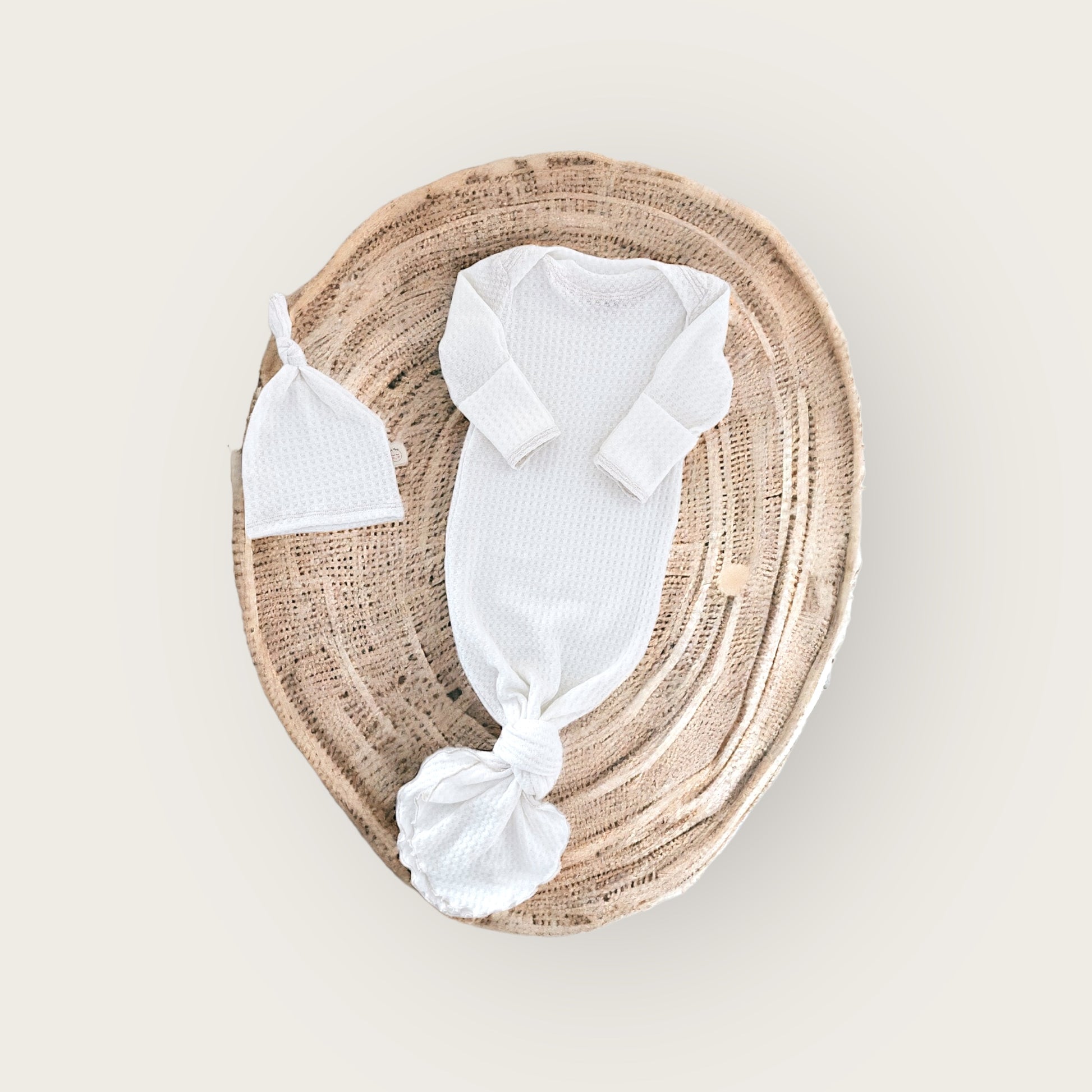 Includes gown and hat. Handmade for exceptional softness, this baby gown is thoughtfully designed with no-scratch cuffs and a knotted bottom for quick, easy diaper changes—blending everyday function with timeless luxury.